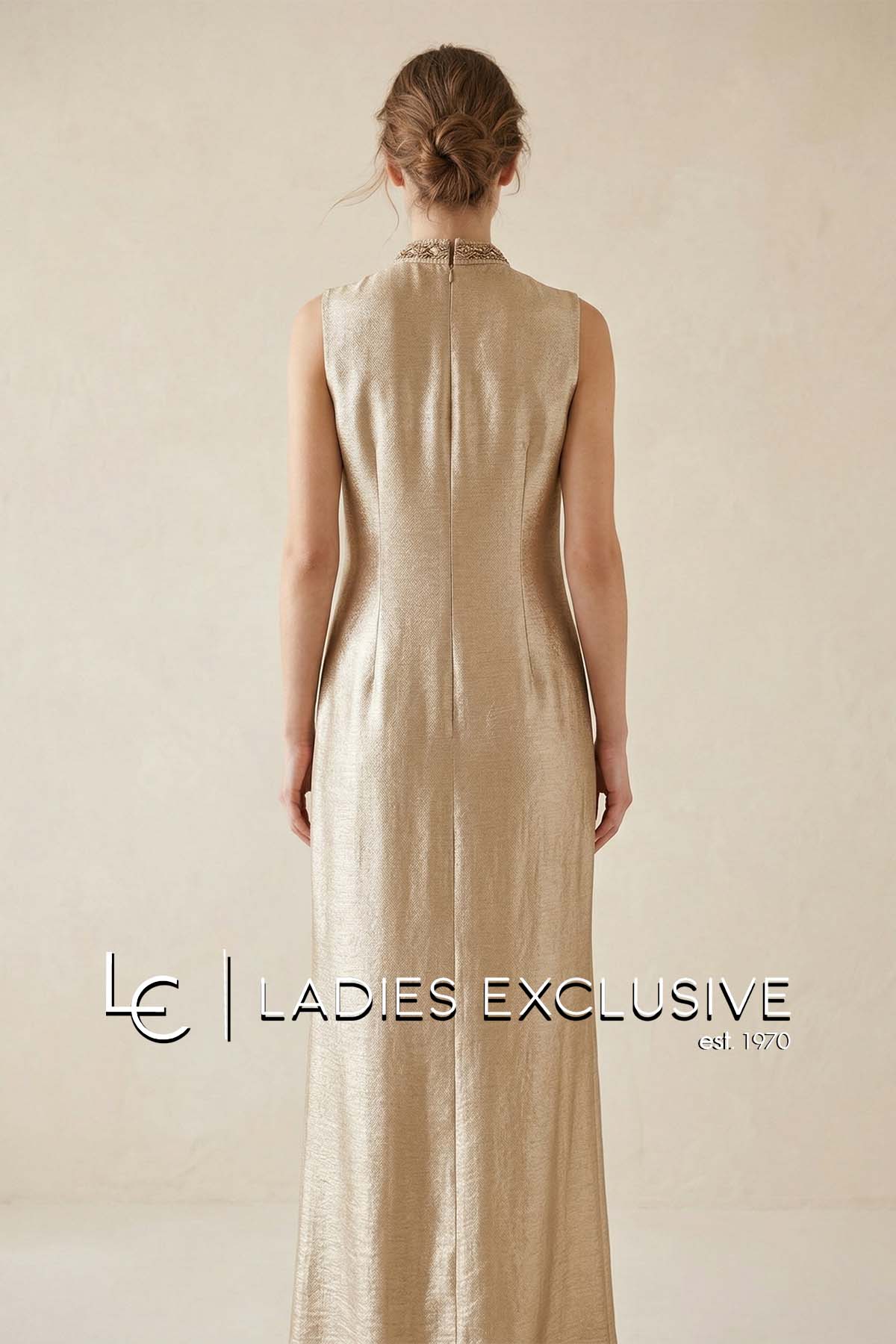 BELLA P. Φόρεμα nude αμάνικο μακρύ με διακοσμητικές πέτρες στο πάνω μέρος και γραμμή A με ανοίγματα στο κάτω.