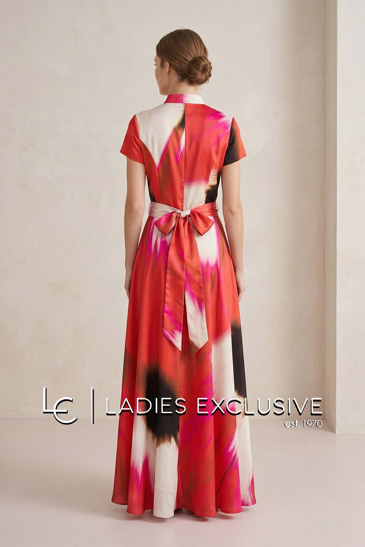 BELLA P. Φόρεμα κοντομάνικο μακρύ κλος σατέν σε κόκκινες αποχρώσεις, με όρθιο γιακά, ιδιαίτερα κουμπιά και ζώνη.