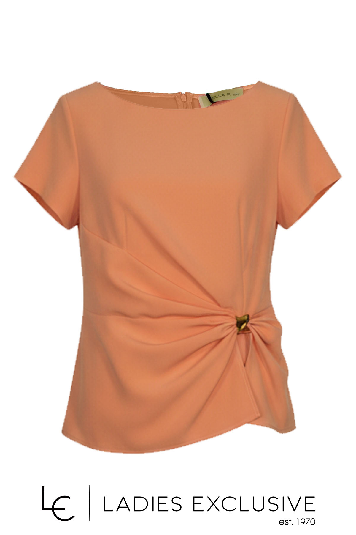 BELLA P. Μπλούζα peach κοντομάνικη κρεπ, με ιδιαίτερο ντραπέ σχέδιο. Γίνεται σετ με την παντελόνα με κωδικό 21261.03105.0121.57.