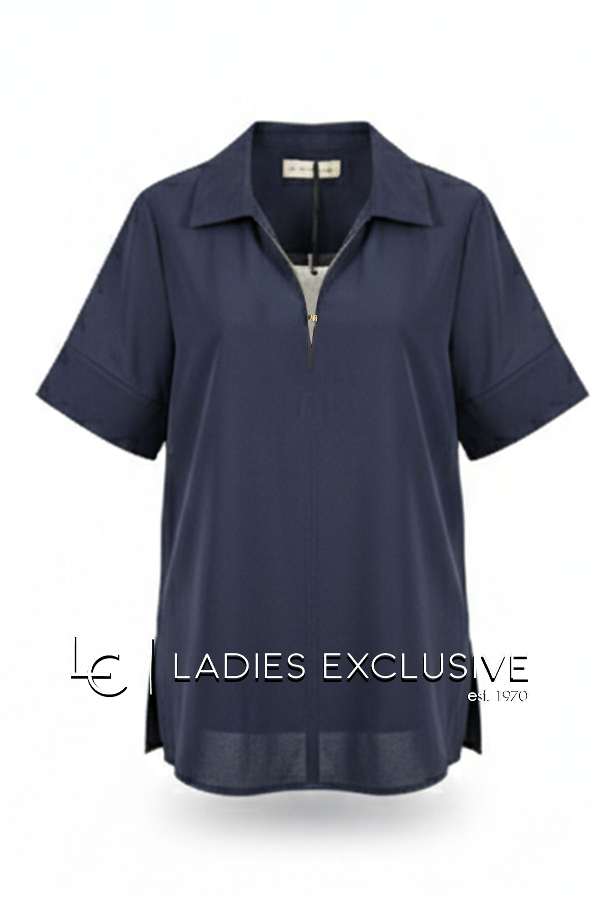 BELLA P. Μπλούζα μπλε κοντομάνικη με πέτο γιακά σε άνετη γραμμή, που κλείνει μπροστά με ιδιαίτερο κουμπί και έχει ανοίγματα στο πλάι.