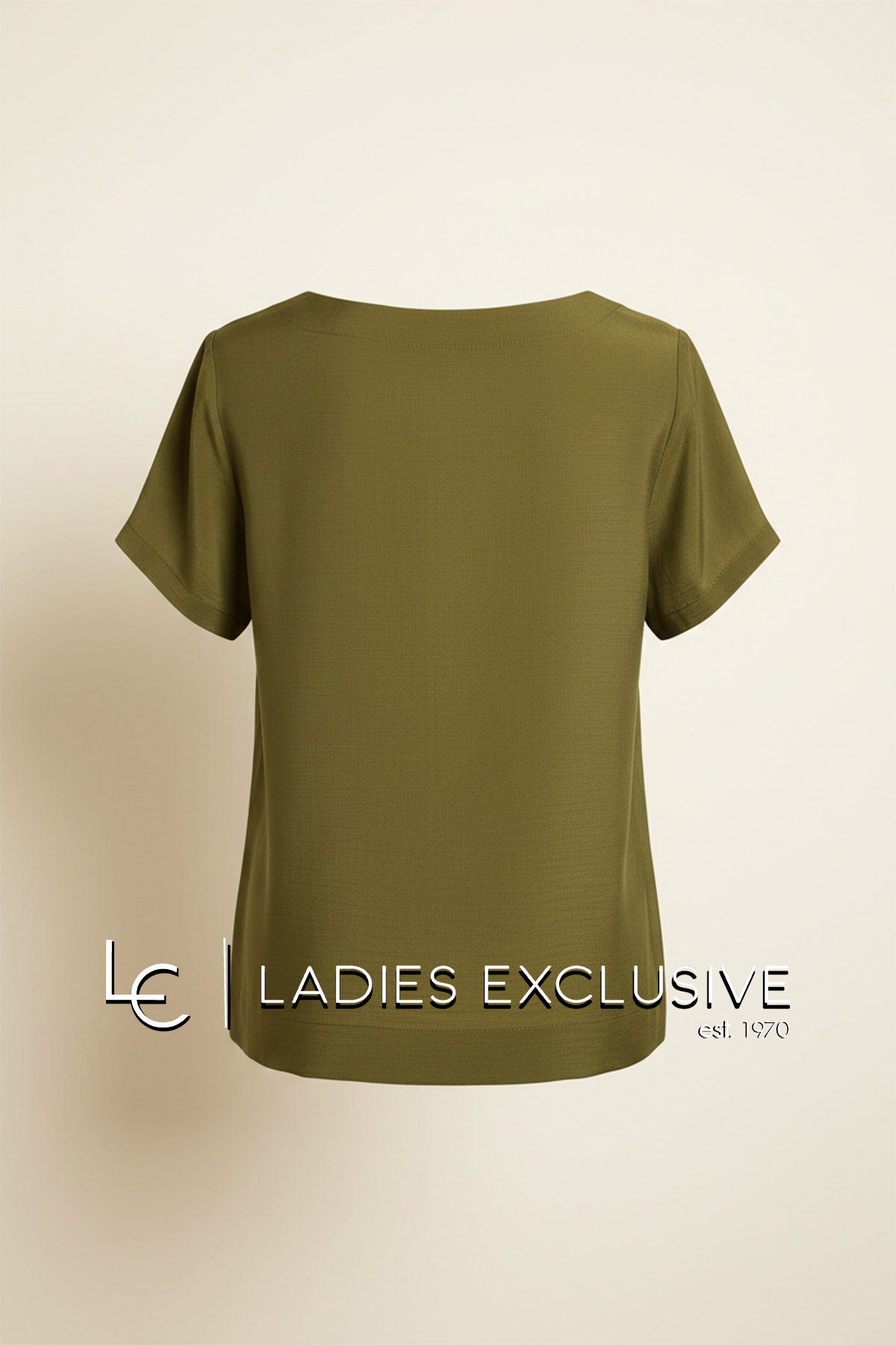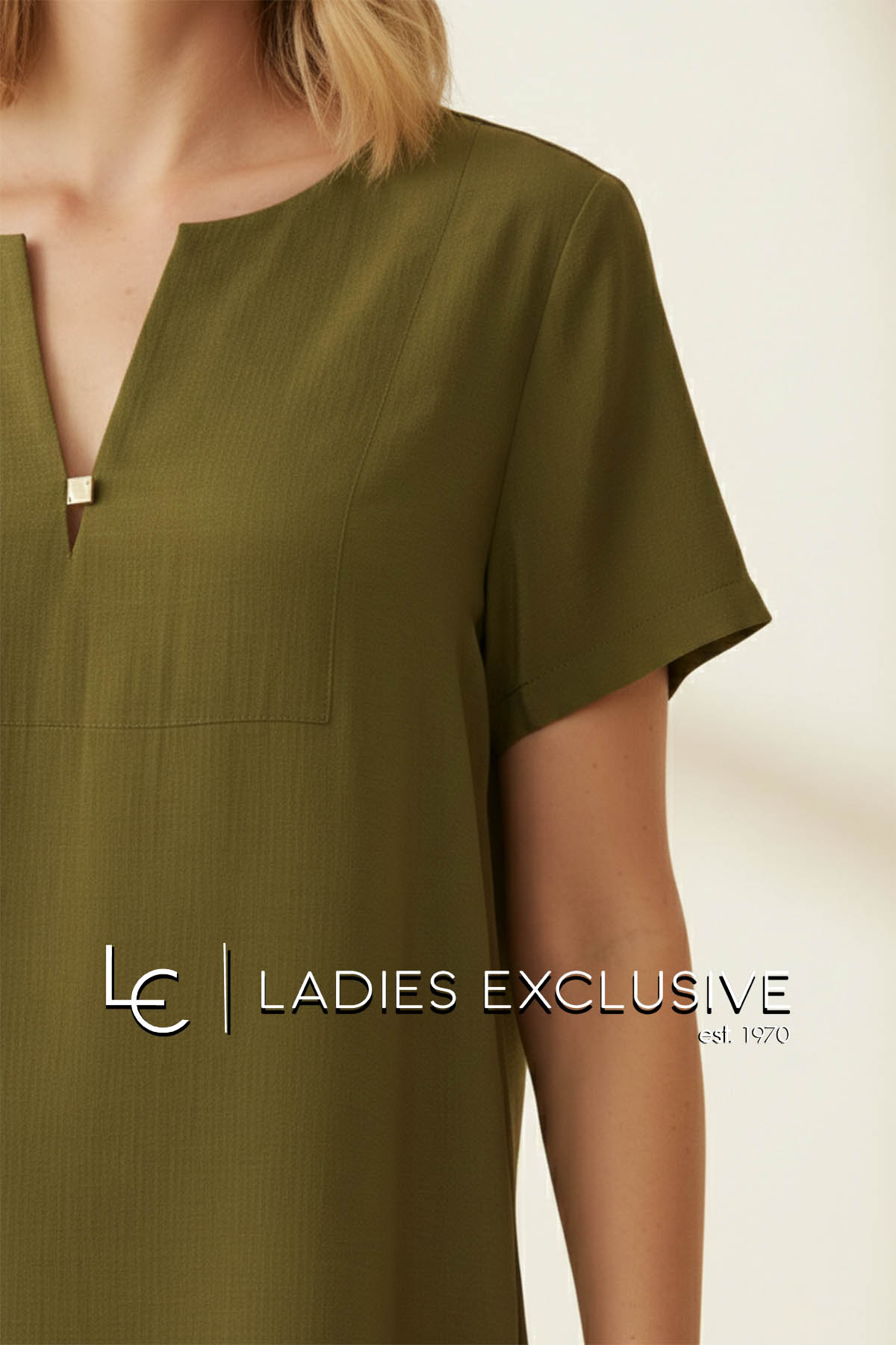 BELLA P. Μπλούζα λαδί κοντομάνικη από μαλακό ύφασμα με ανοιγμα v και ιδιαίτερο κουμπί.