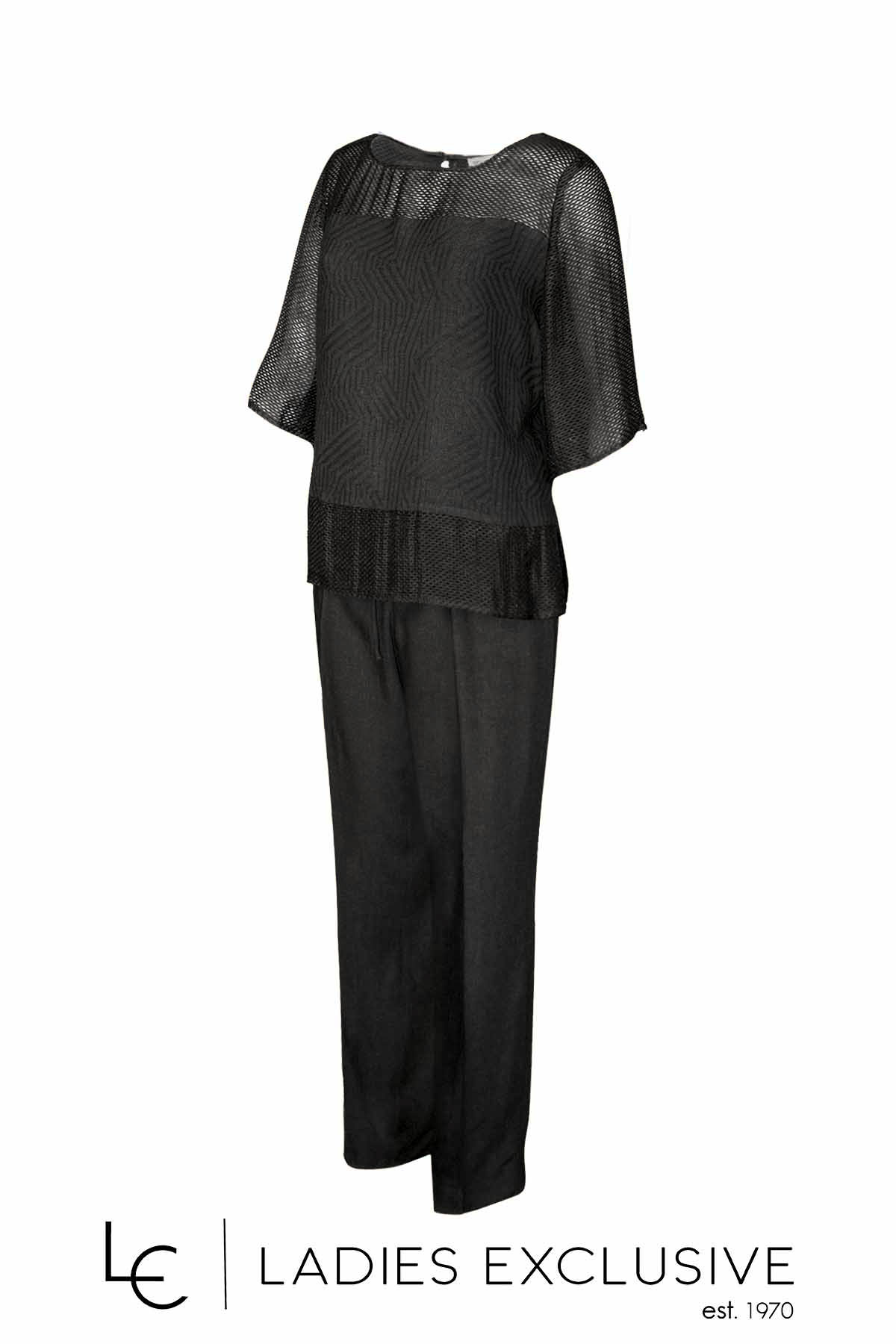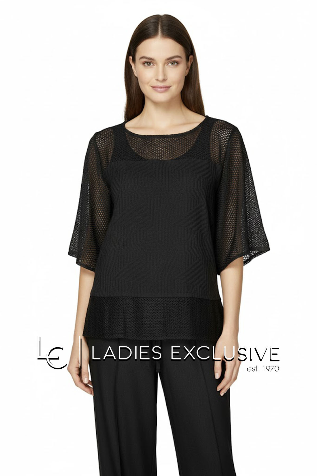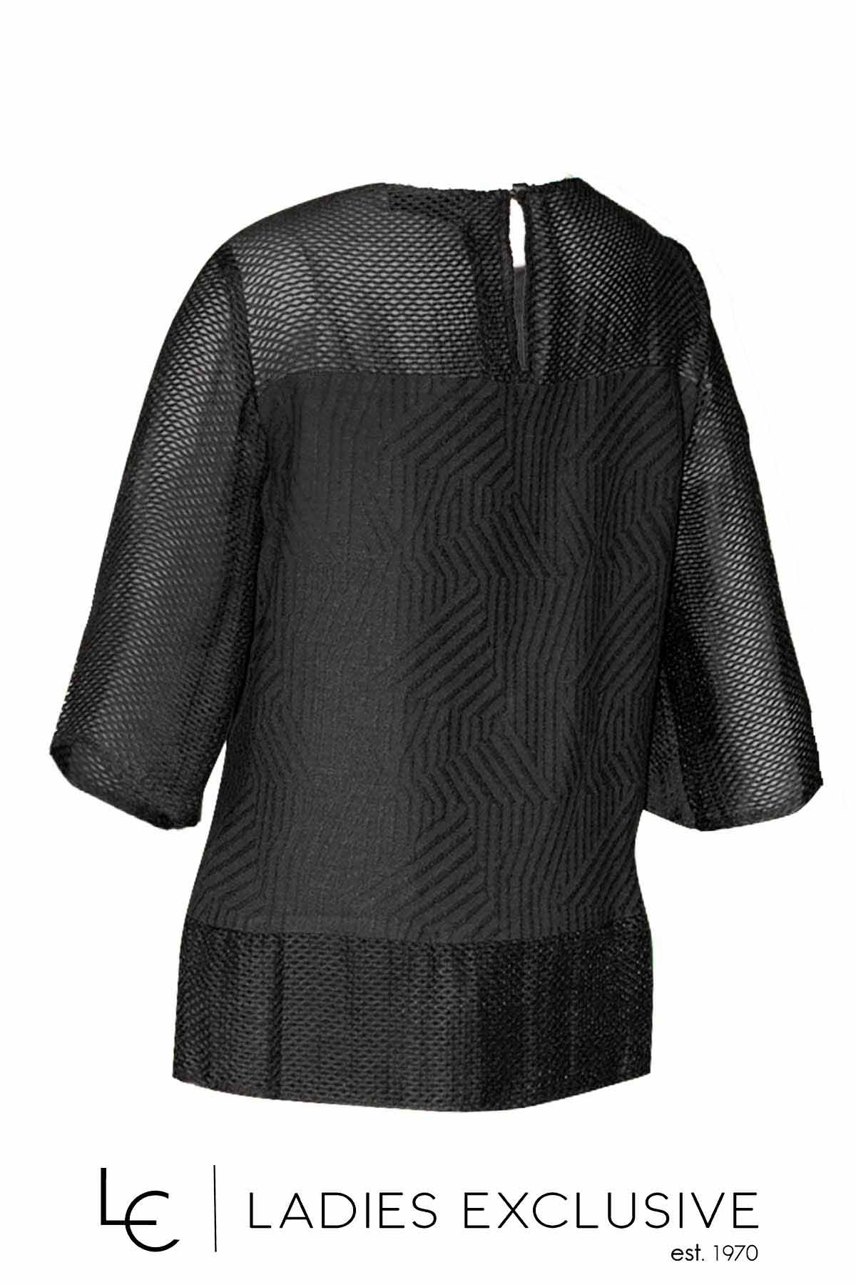 BELLA P. Μπλούζα μαύρη με διαφάνειες, τρυπητή στο πάνω μέρος και στα μανίκια και με ανάγλυφα σχέδια στο υπόλοιπο μέρος. Γίνεται σετ με το παντελόνι με κωδικό 21252.1463.03121.01.