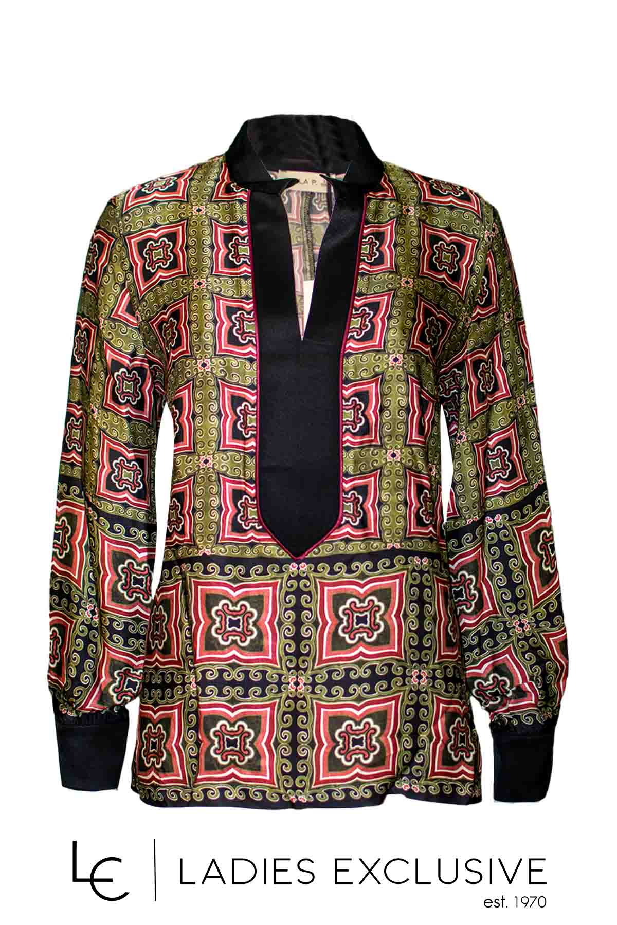 BELLA P. Μπλούζα εμπριμέ σατέν ριχτή από βισκόζη, με μεγάλο άνοιγμα στο μπούστο και ιδιαίτερες μανσέτες στο μανίκι.