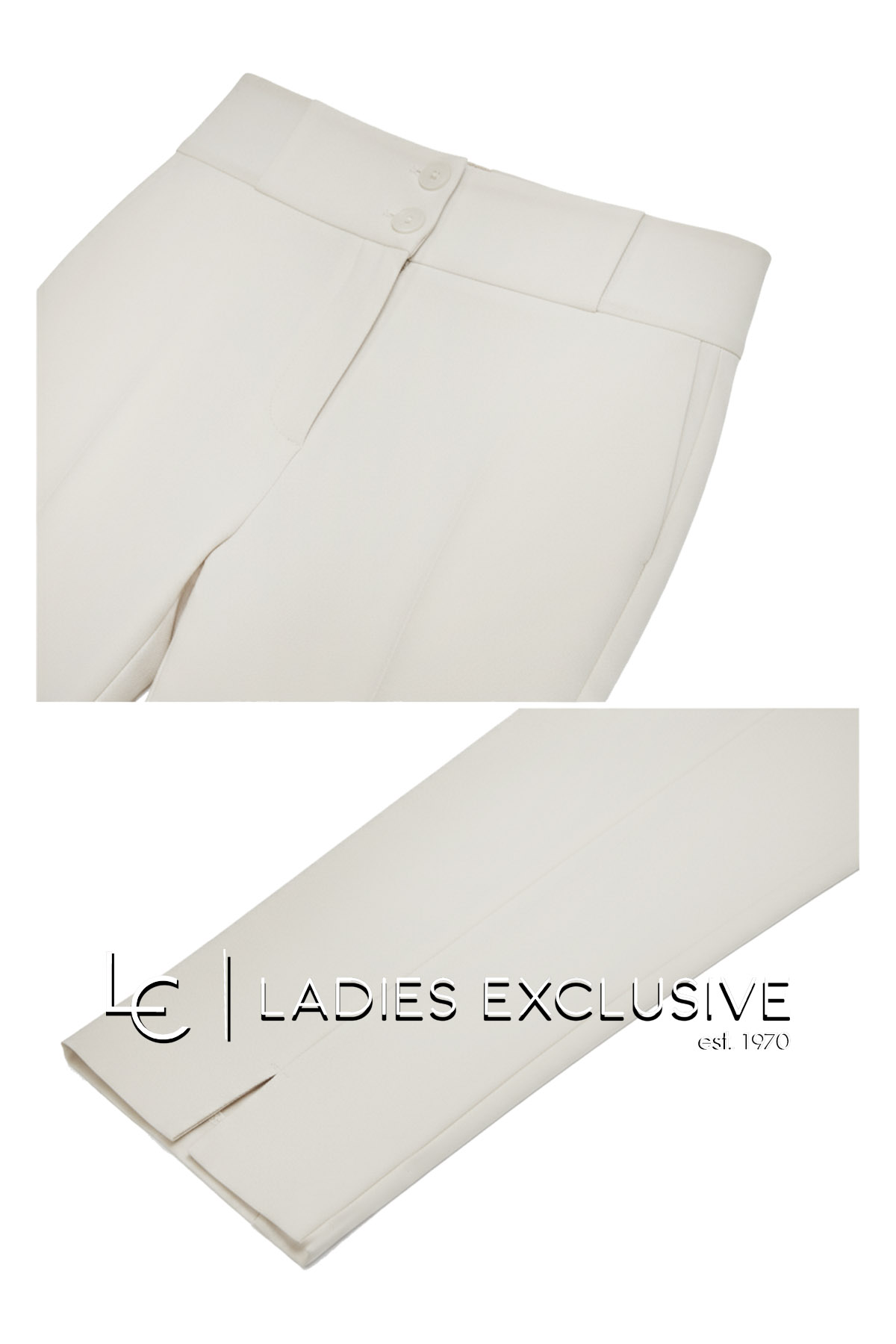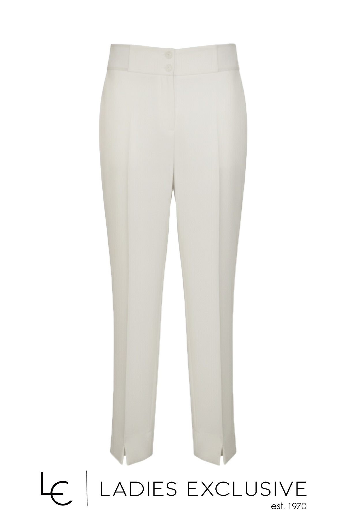 BELLA P. Παντελόνι λευκό κρεπ με λάστιχο στη μέση και μικρό άνοιγμα στο κάτω μέρος. Γίνεται σετ με το σακάκι με κωδικό 21261.01107.0121.06.
