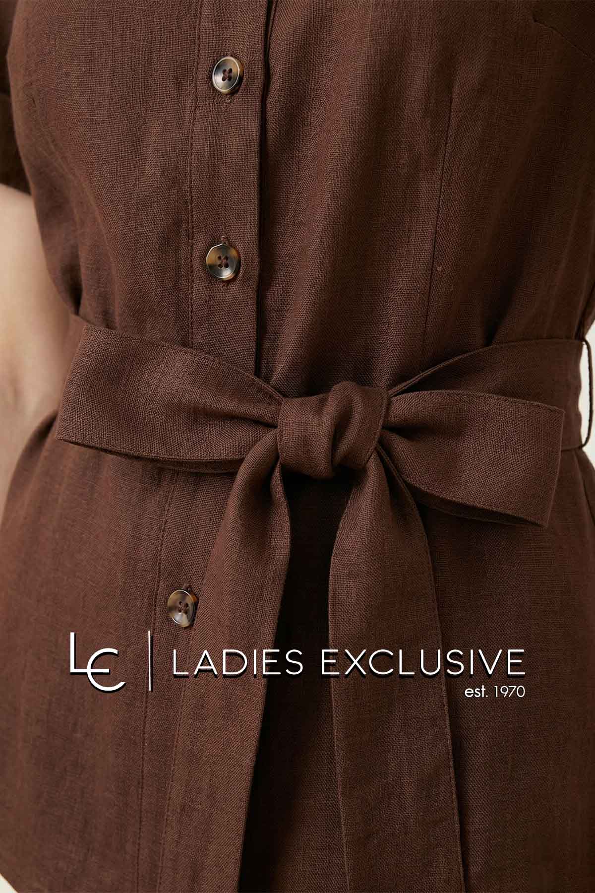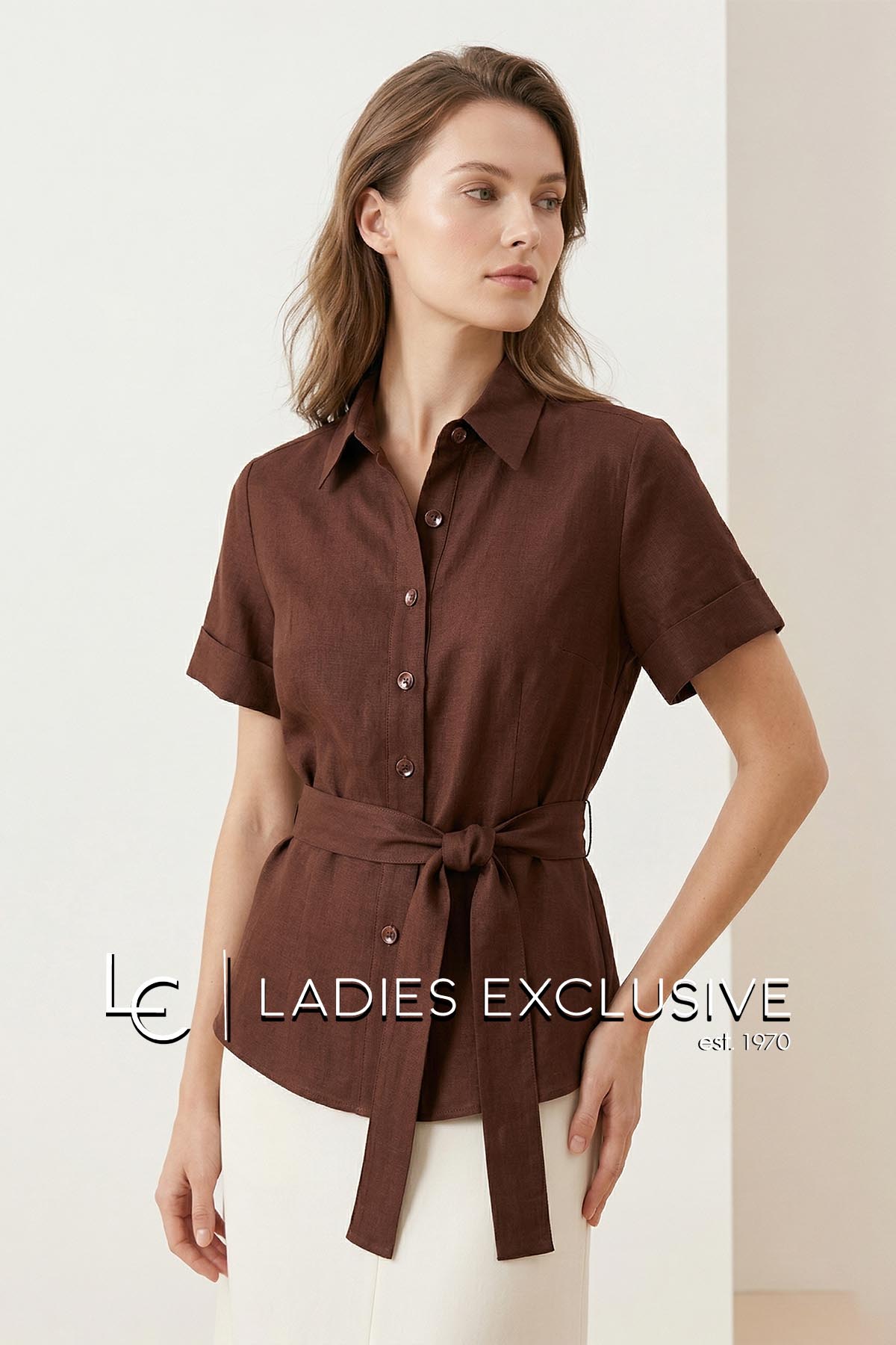 BELLA P. Πουκάμισο καφέ κοντομάνικο λινό με ζώνη. Γίνεται σετ με το παντελόνι με κωδικό 21261.03135.1704.08.