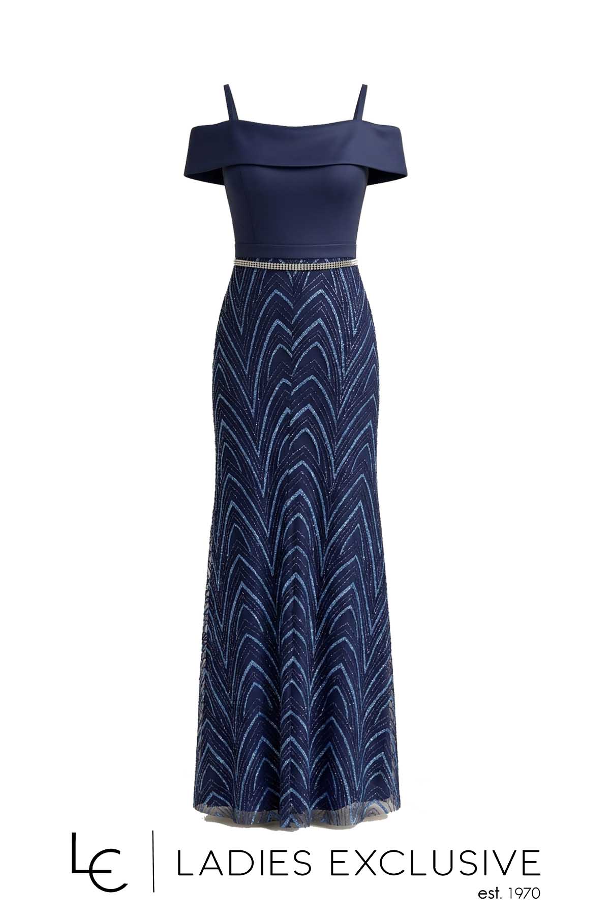 EFFECT Φόρεμα μπλε βραδινό μακρύ με σατέν μπούστο και ύφασμα που φέστει χαμηλά στους ώμους. Η φούστα έχει γκλίτερ και διαθέτει επιπλέον σατέν τιράντες. Έχει ζώνη αλυσίδα με στρας.