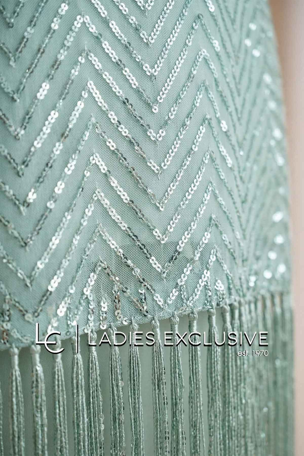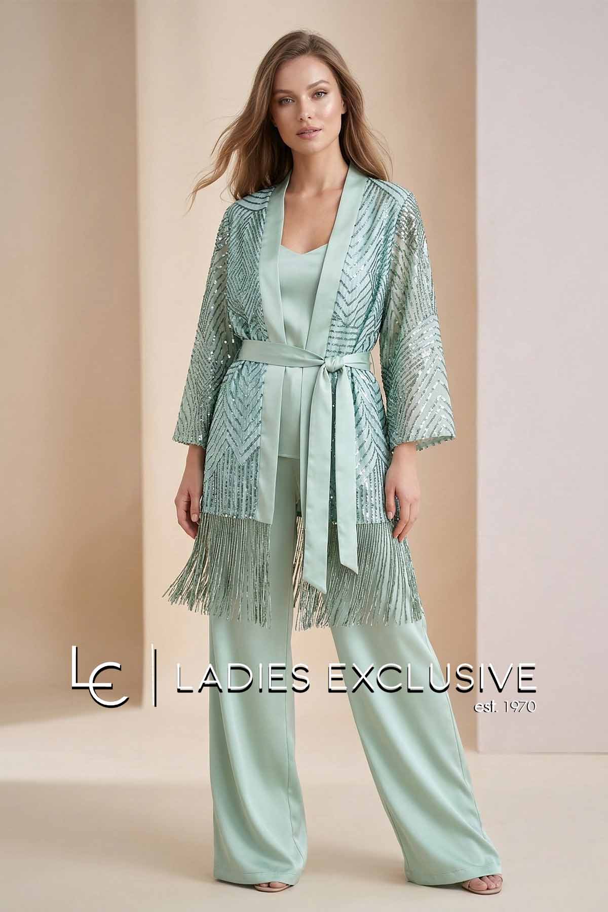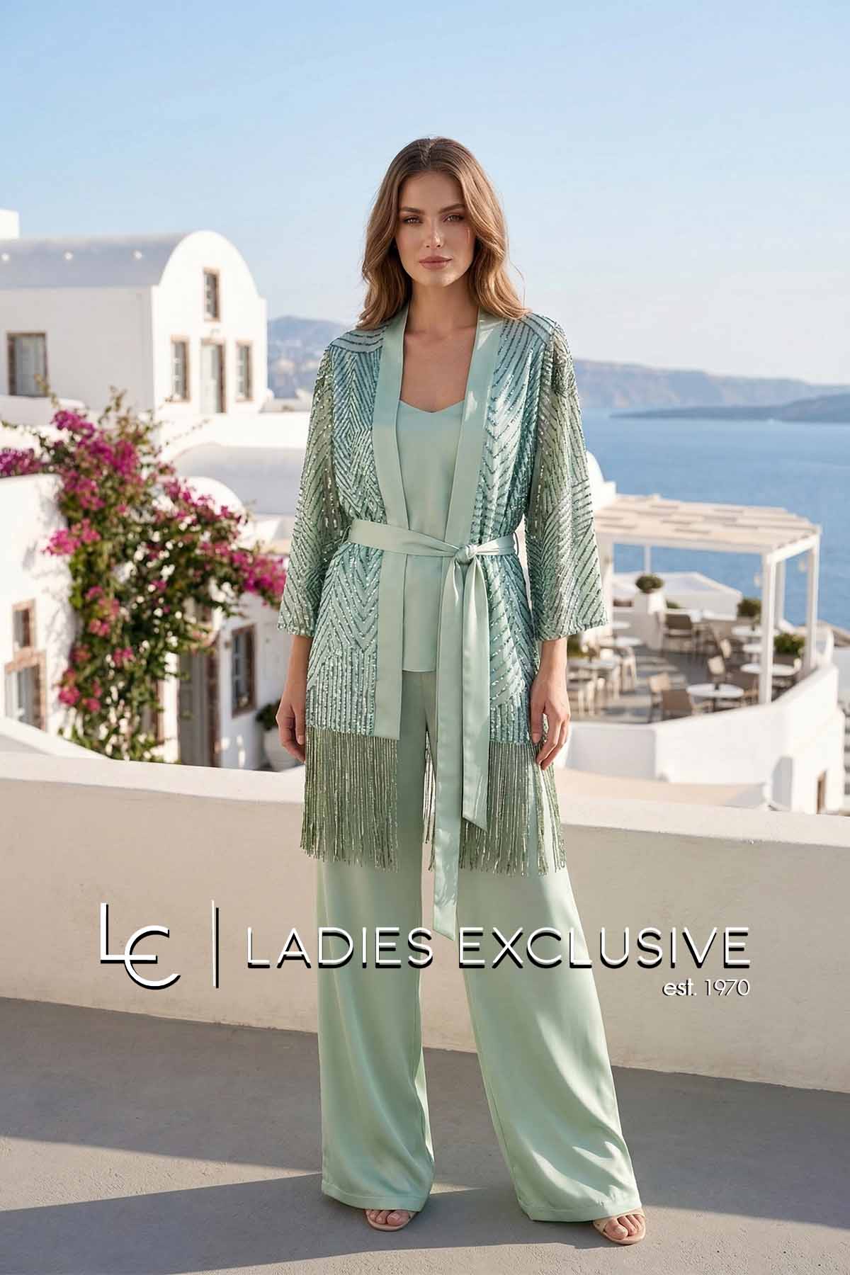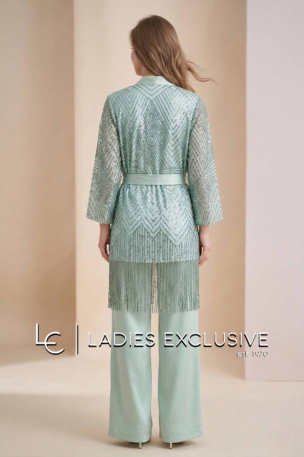 EFFECT Σετ 3 τεμαχίων μέντα βραδινό. Αποτελείται από τουνίκ κεντημένη με παγιέτες και σατέν τελειώματα με κρόσια και ζώνη, τοπ σατέν με λεπτή ράντα και σατέν παντελόνα με λάστιχο στη μέση.