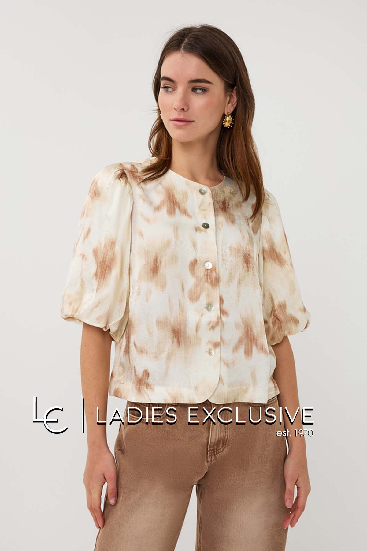 ESQUALO Τοπ σε γήινες αποχρώσεις σατέν με ballon μανίκια και ανάγλυφα σχέδια.
