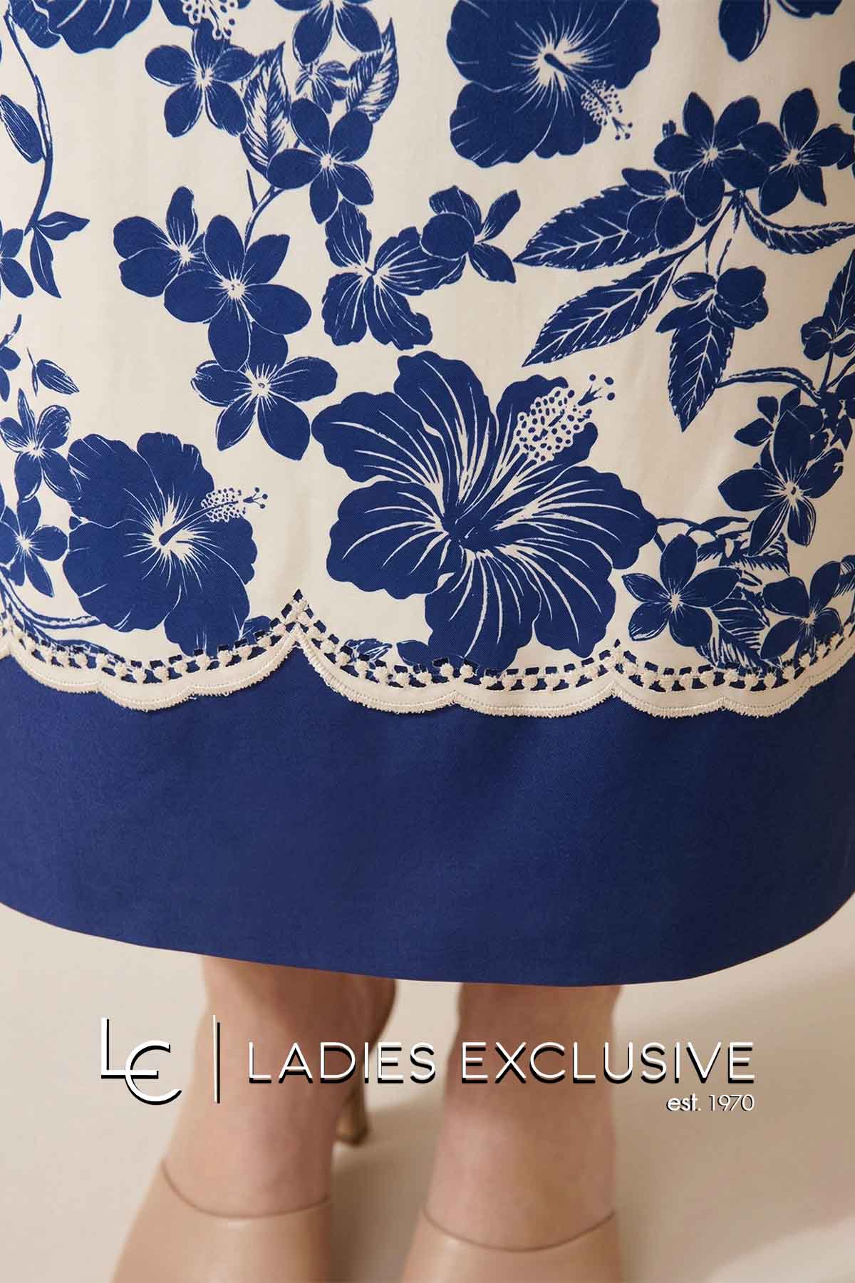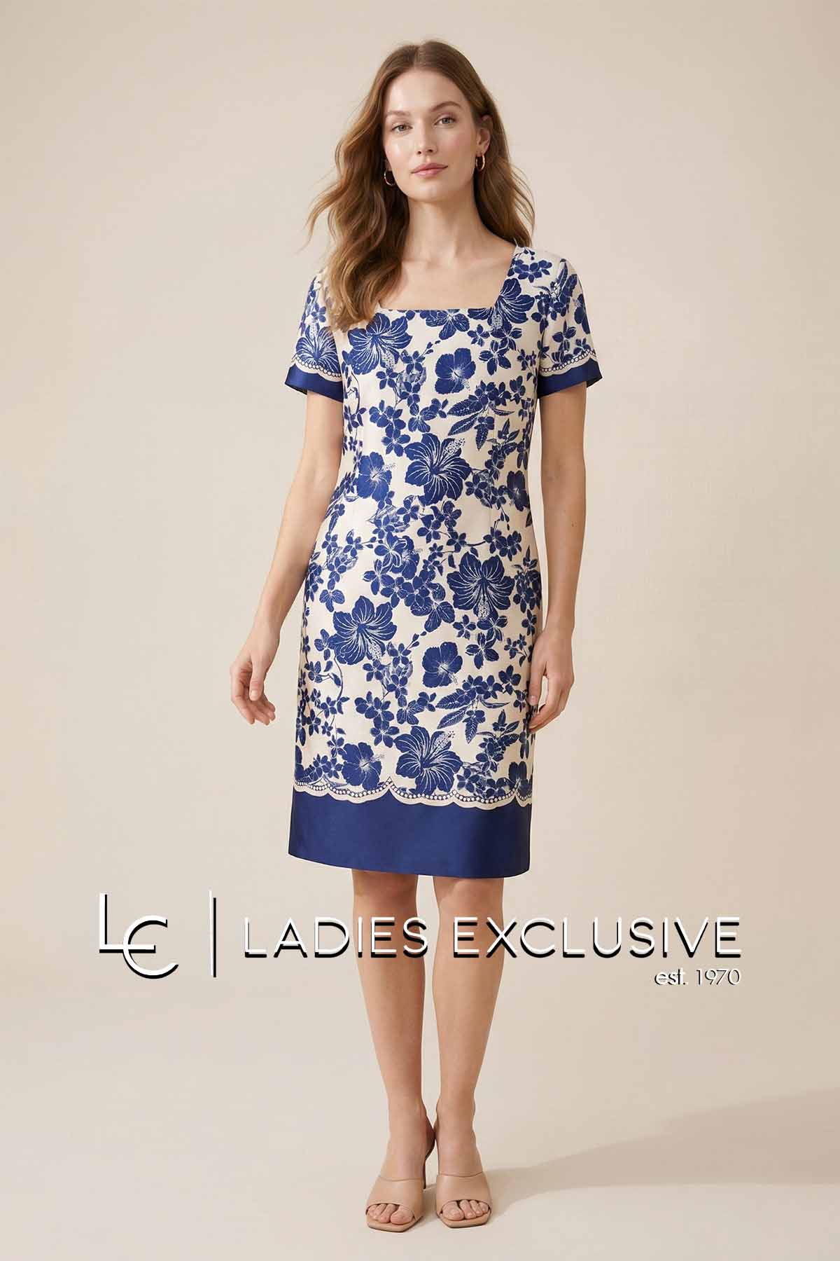 ESTEL Φόρεμα μπλε φλοράλ κοντομάνικο σατέν με τετράγωνη λαιμόκοψη.