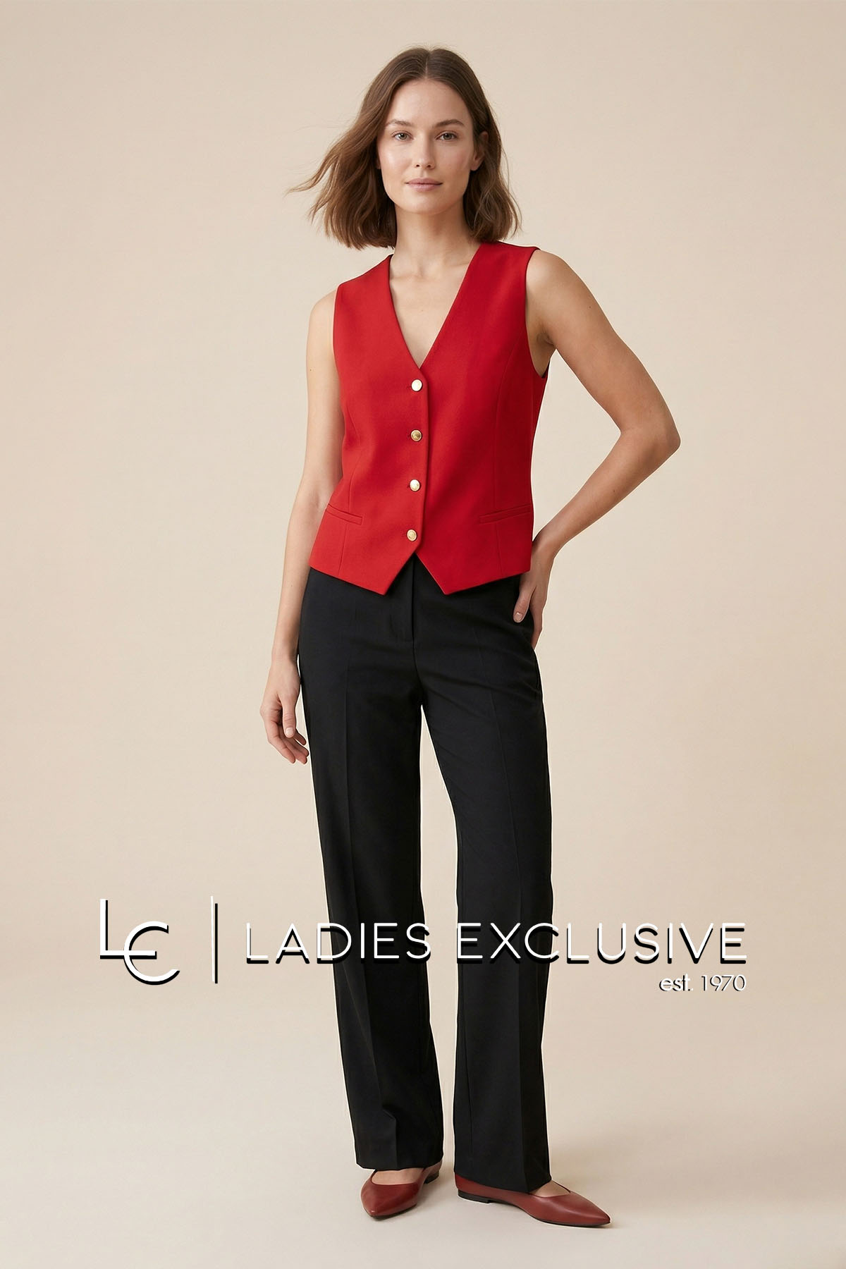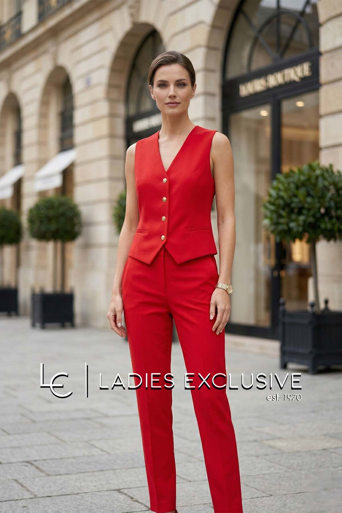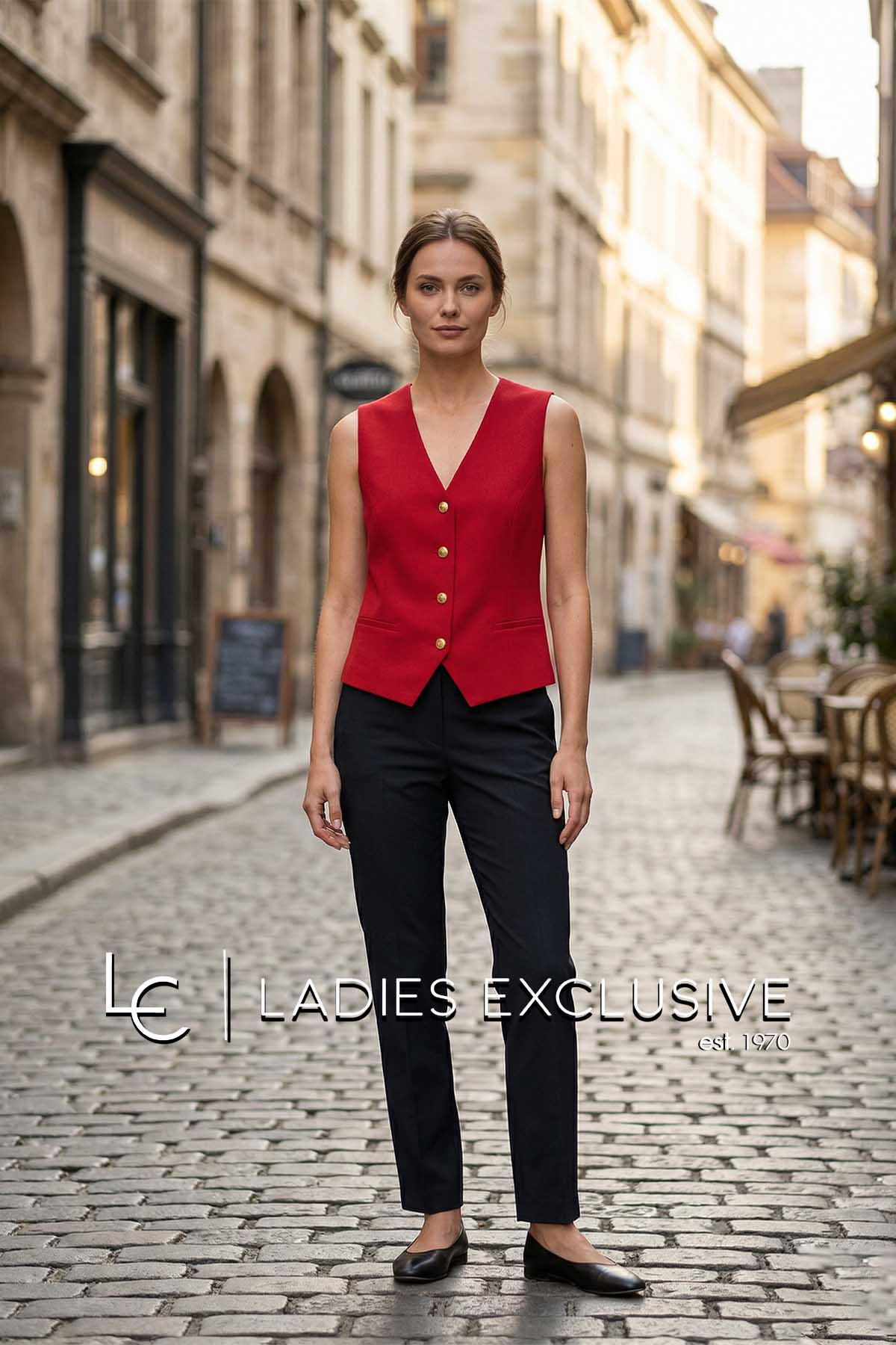 ESTEL Γιλέκο κόκκινο κρεπ με ιδιαίτερα κουμπιά. Γίνεται σετ με το σακάκι με κωδικό 08700-00.02 και με το παντελόνι με κωδικό 08710-00.02.