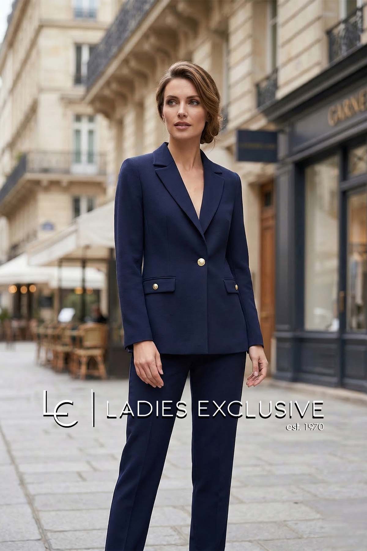 ESTEL Σακάκι μπλε κρεπ με μονό κουμπί, πέτο γιακά και τσέπες με καπάκια. Γίνεται σετ με το παντελόνι με κωδικό 08710-00.03 και με τη φούστα με κωδικό 08707-00.03.