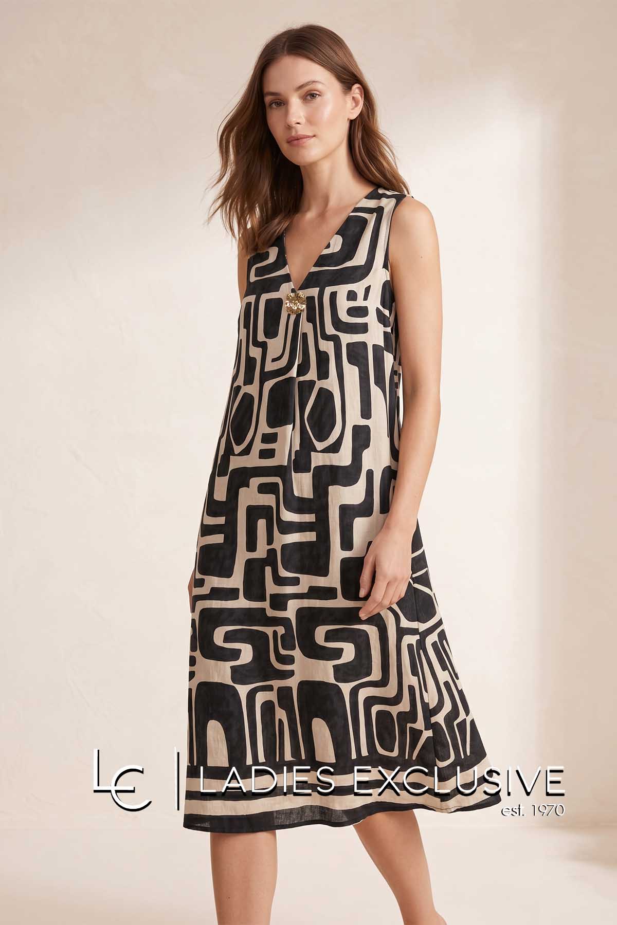 FIBES Φόρεμα μαύρο με λευκό αμάνικο σε άνετη γραμμή, με ιδιαίτερη καρφίτσα και μεγάλη πιέτα μπροστά.