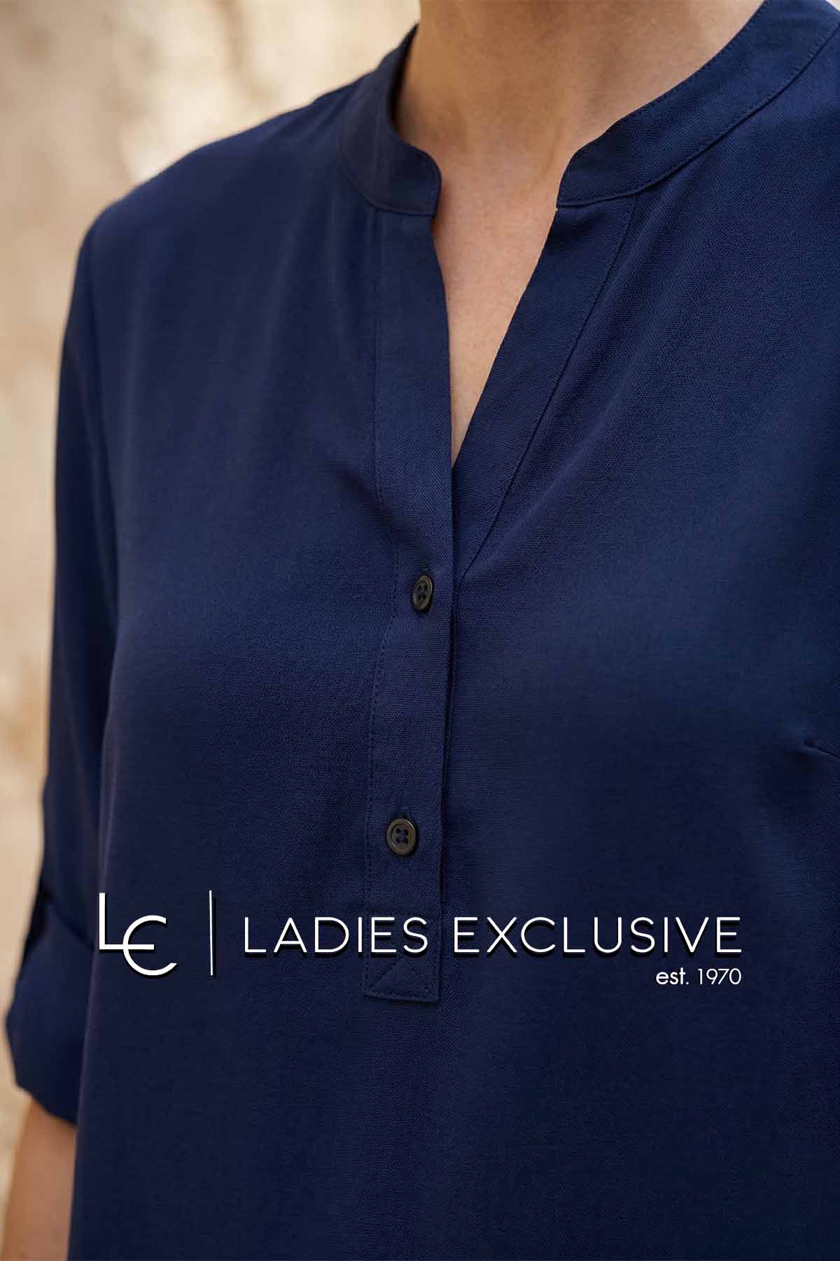 FIBES Μπλούζα μπλε σε άνετη γραμμή με άνοιγμα v και κουμπιά. Το μανίκι γυρίζει και κουμπώνει.