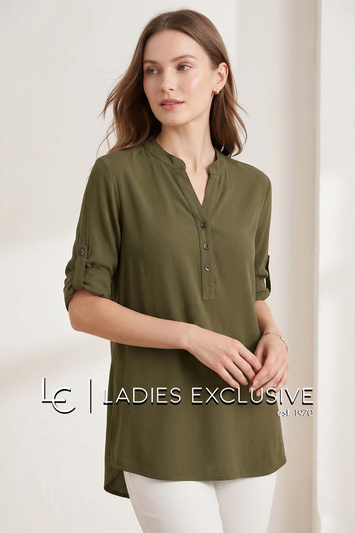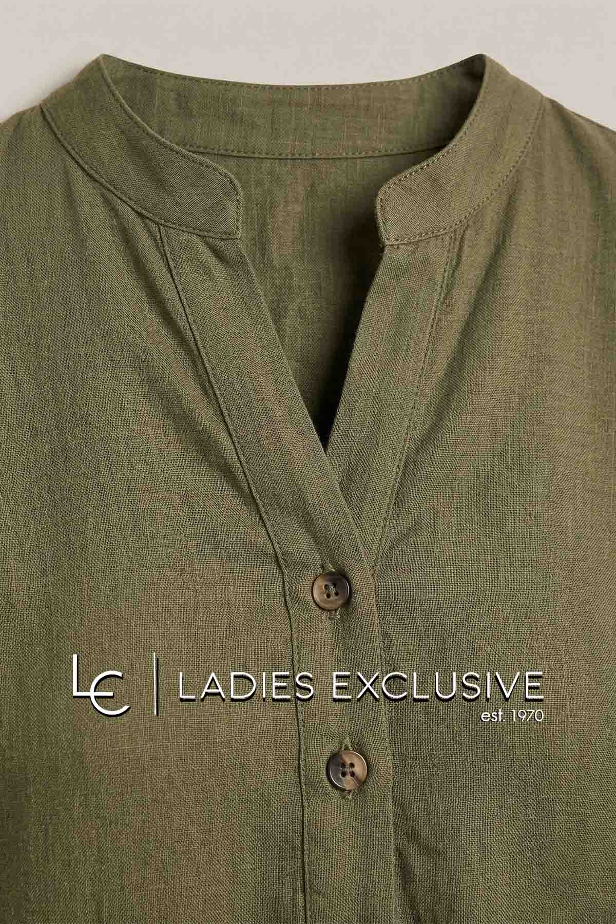 FIBES Μπλούζα χακί σε άνετη γραμμή με άνοιγμα v και κουμπιά. Το μανίκι γυρίζει και κουμπώνει.
