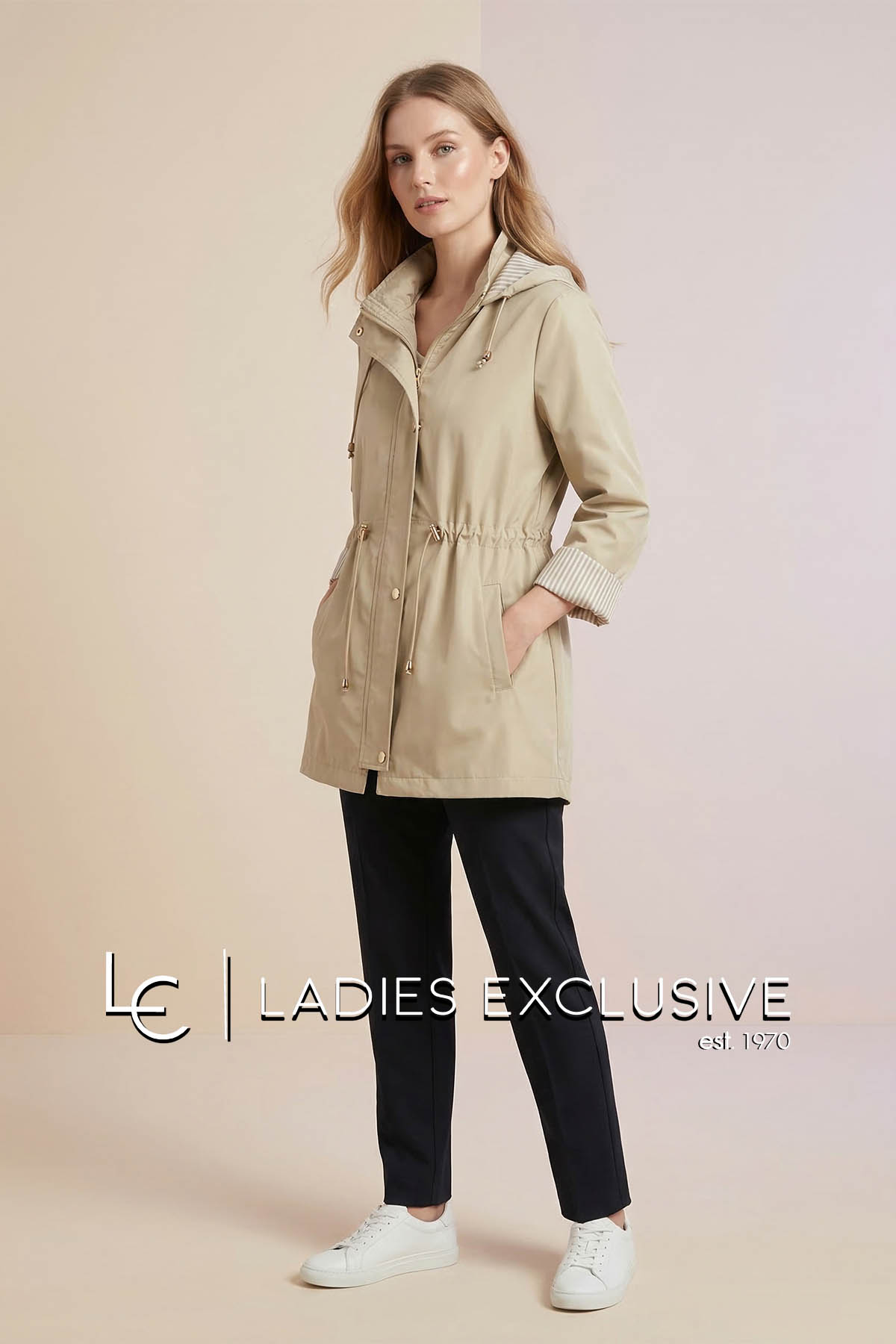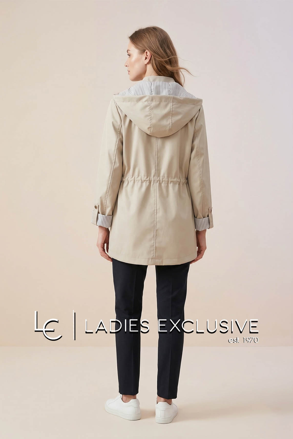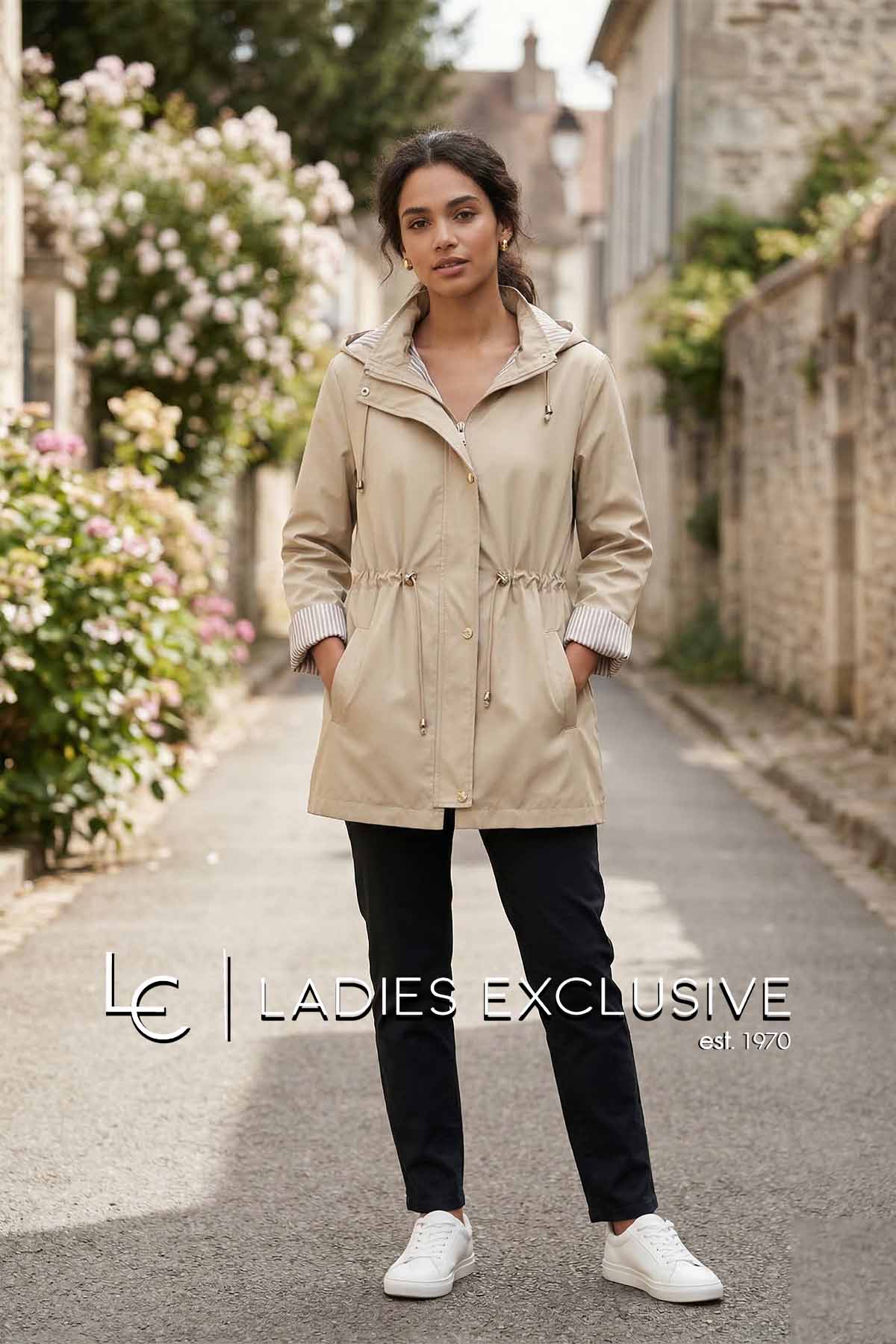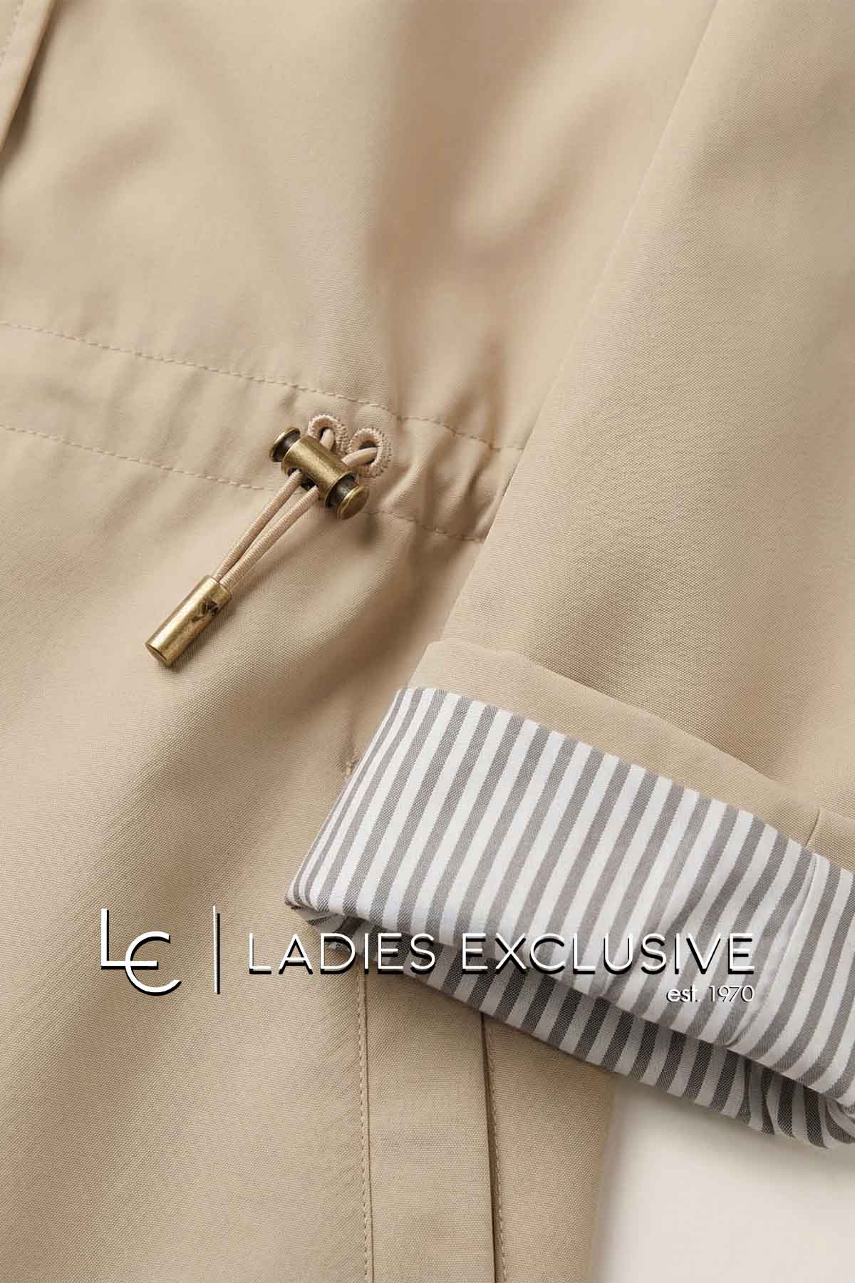 FIBES Μπουφάν μπεζ αντιανεμικό με κουκούλα που αφαιρείται και ελαστικό σούρωμα στη μέση.