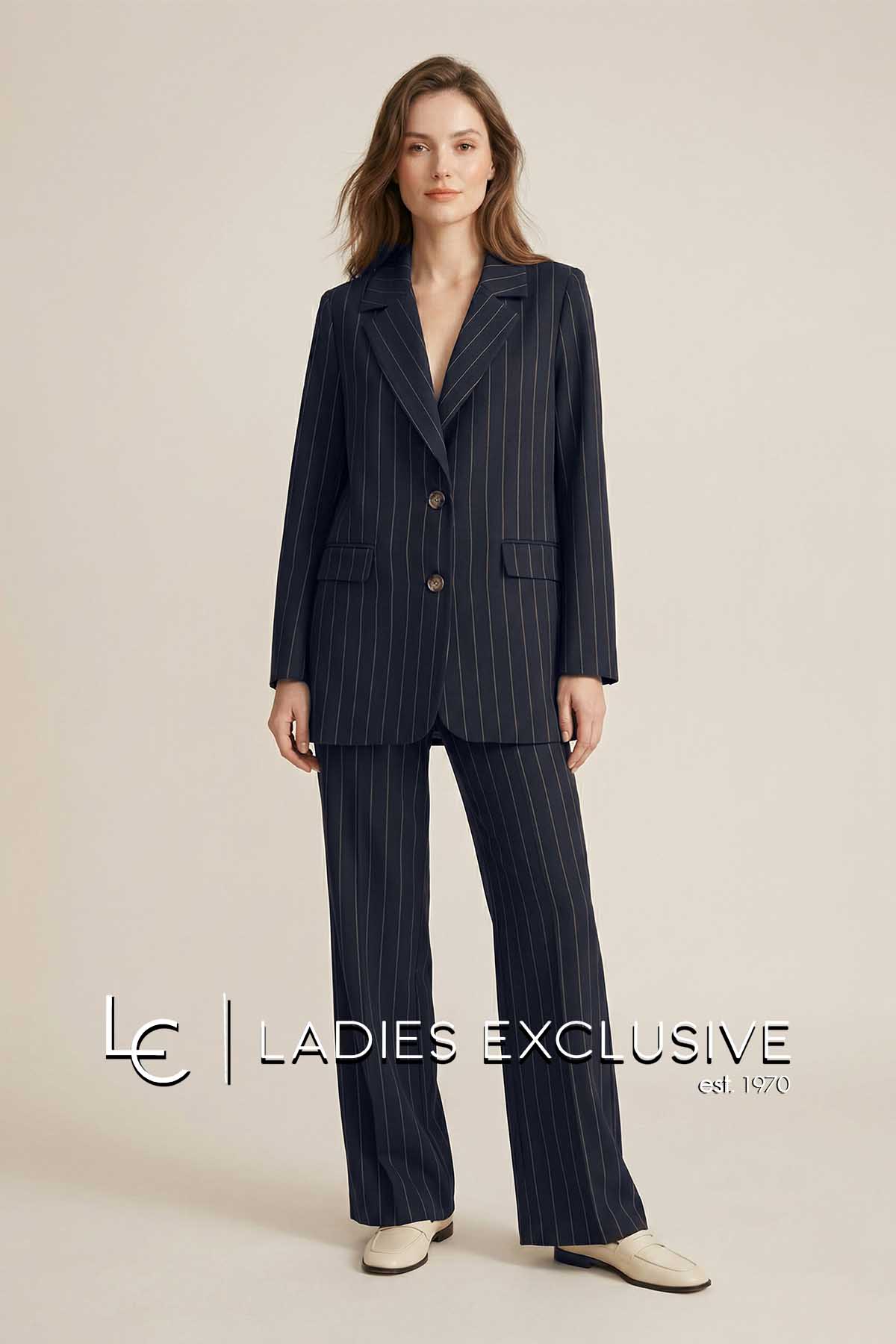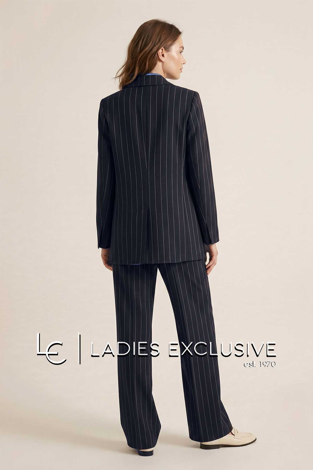 FIBES Σακάκι μπλε ριγέ κρεπ blazer μακρύ. Γίνεται σετ με το παντελόνι με κωδικό 04-8122.03.