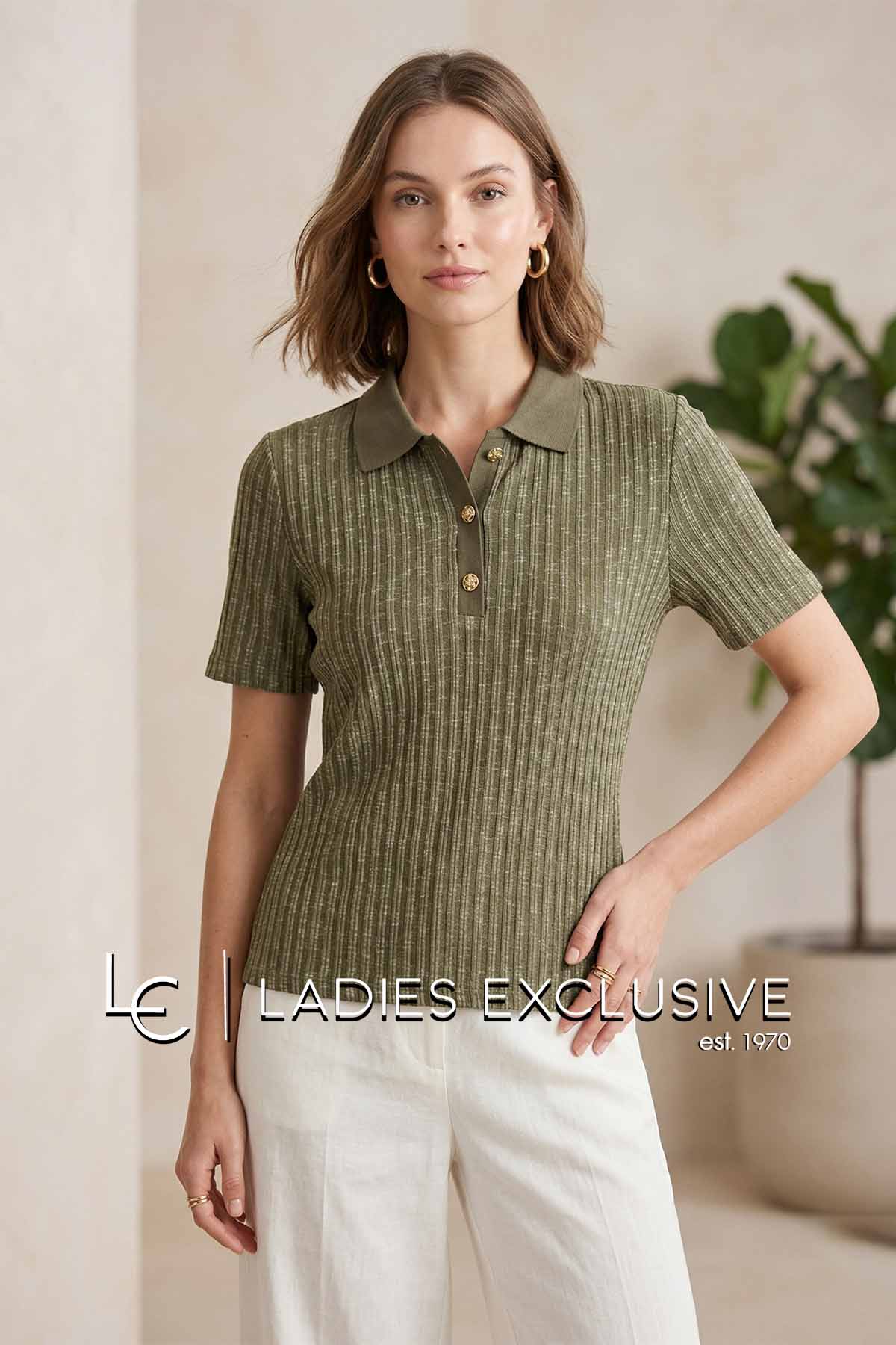 FRANSA Μπλούζα λαδί κοντομάνικη πλεκτή με πόλο γιακά και κουμπιά.
