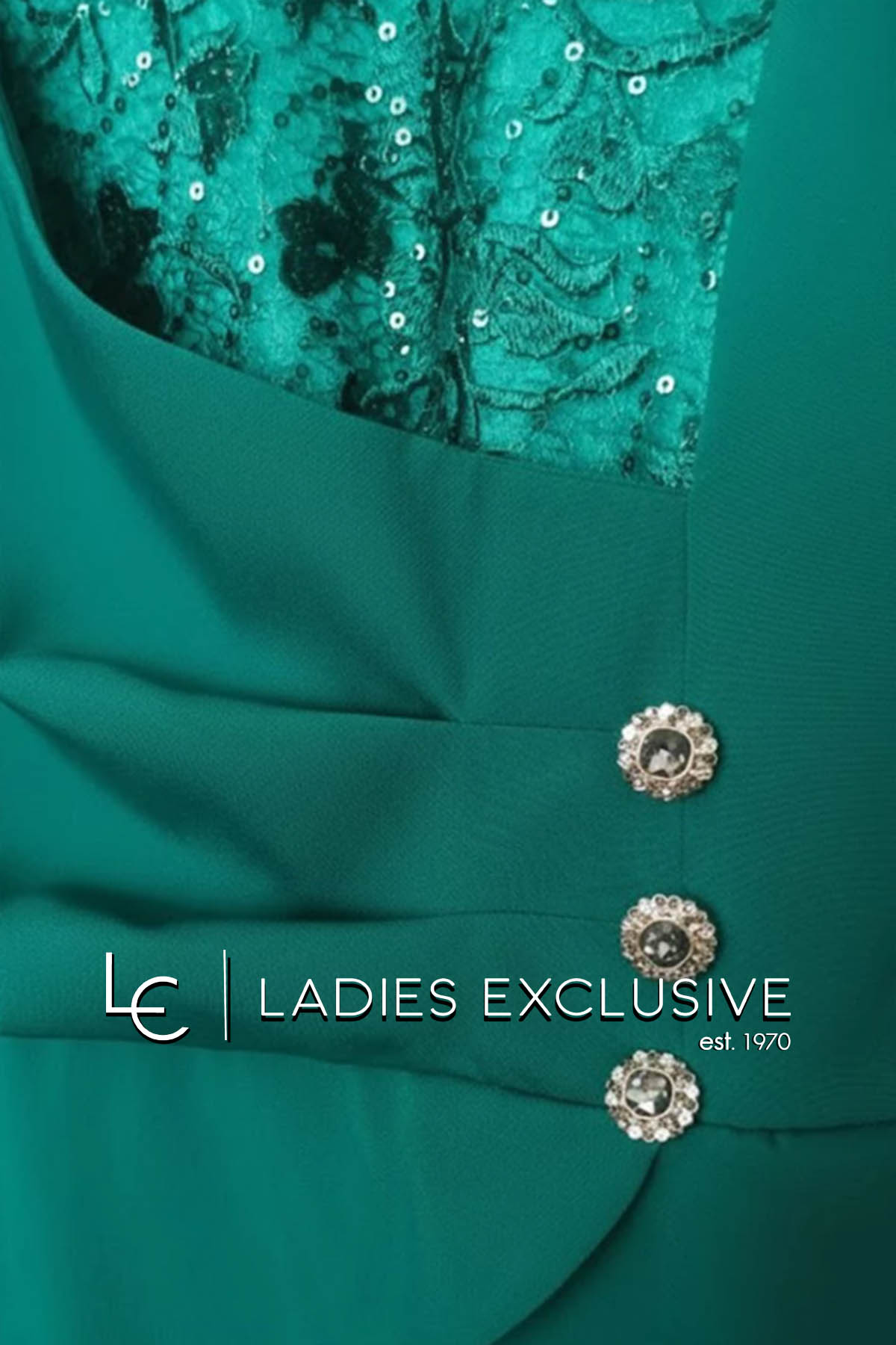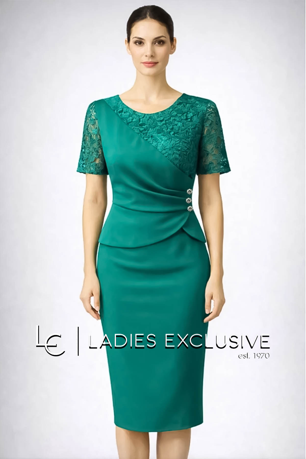 WEFTS Φόρεμα πράσινο μίντι κοντομάνικο με κεντημένη δαντέλα στο πάνω μέρος και μπάσκα με διακοσμητικά κουμπιά στη μέση.